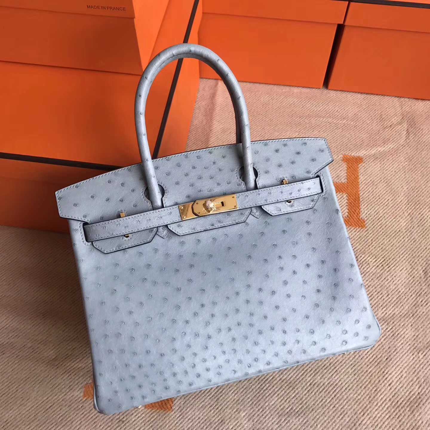 Brand: Hermes; Style: Birkin Bag; Material: Ostrich Leather;Color:8U Blue Glacier; Size:30cm; Hardware: Gold; Accessories: Padlock and keys, Dust Bag.Function:Tote Bag.