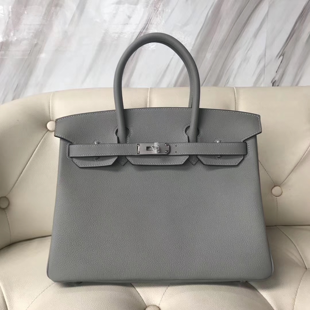 Brand: Hermes; Style: Birkin Bag; Material:Togo Calf Leather;Color:4Z Gris Mouette/R2 Agate Blue; Size:30cm; Hardware:Silver;Accessories: Padlock fand Keys, Dust Bag.Function:Tote Bag.