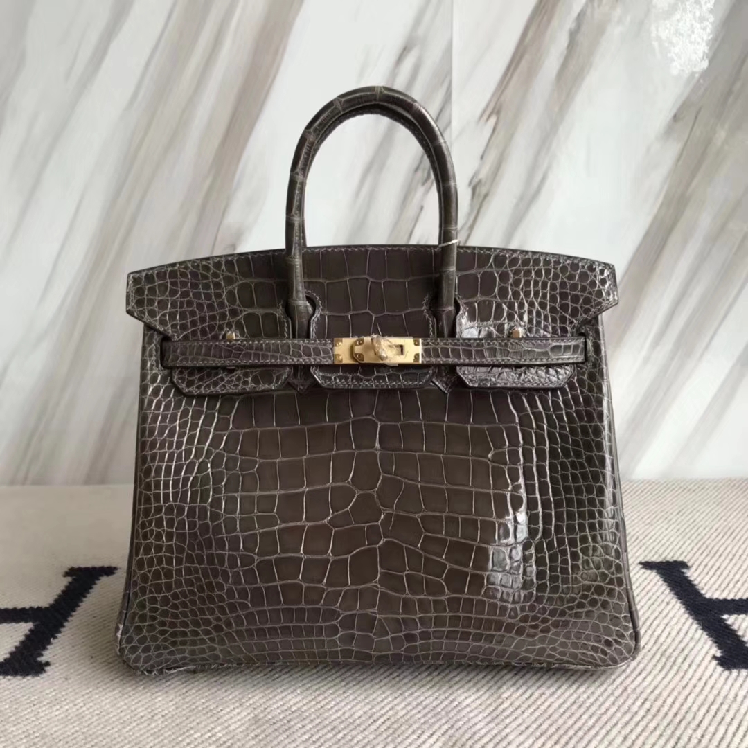 Brand: Hermes; Style: Birkin Bag; Material:Alligator Shiny Crocodile Leather;Color:88 Graphite Grey; Size:25cm; Hardware:Gold;Accessories: Padlock fand Keys, Dust Bag.Function:Tote Bag.