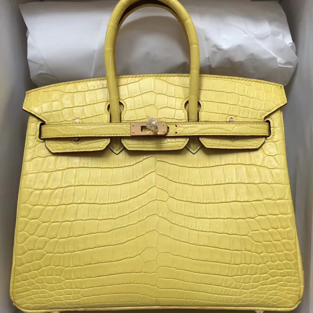 Brand: Hermes; Style: Birkin Bag; Material:Crocodile Matt Leather;Color:9R Lemon Yellow; Size:25cm; Hardware:Gold;Accessories: Padlock fand Keys, Dust Bag.Function:Tote Bag.