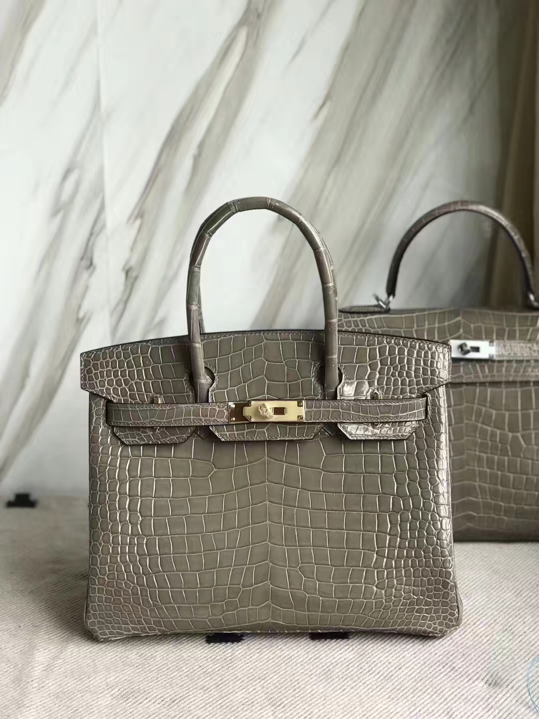 Brand: Hermes; Style: Birkin Bag; Material:Porosus Shiny Crocodile Leather;Color:C81 Gris Tourterelle; Size:30cm; Hardware:Gold;Accessories: Padlock fand Keys, Dust Bag.Function:Tote Bag.