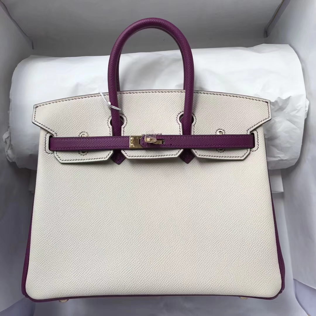 Brand: Hermes; Style: Birkin Bag; Material: Epsom Calf Leather;Color:CK10 Craie/P9 Anemone Purple; Size:25cm; Hardware:Gold;Accessories: Padlock fand Keys, Dust Bag.Function:Tote Bag.