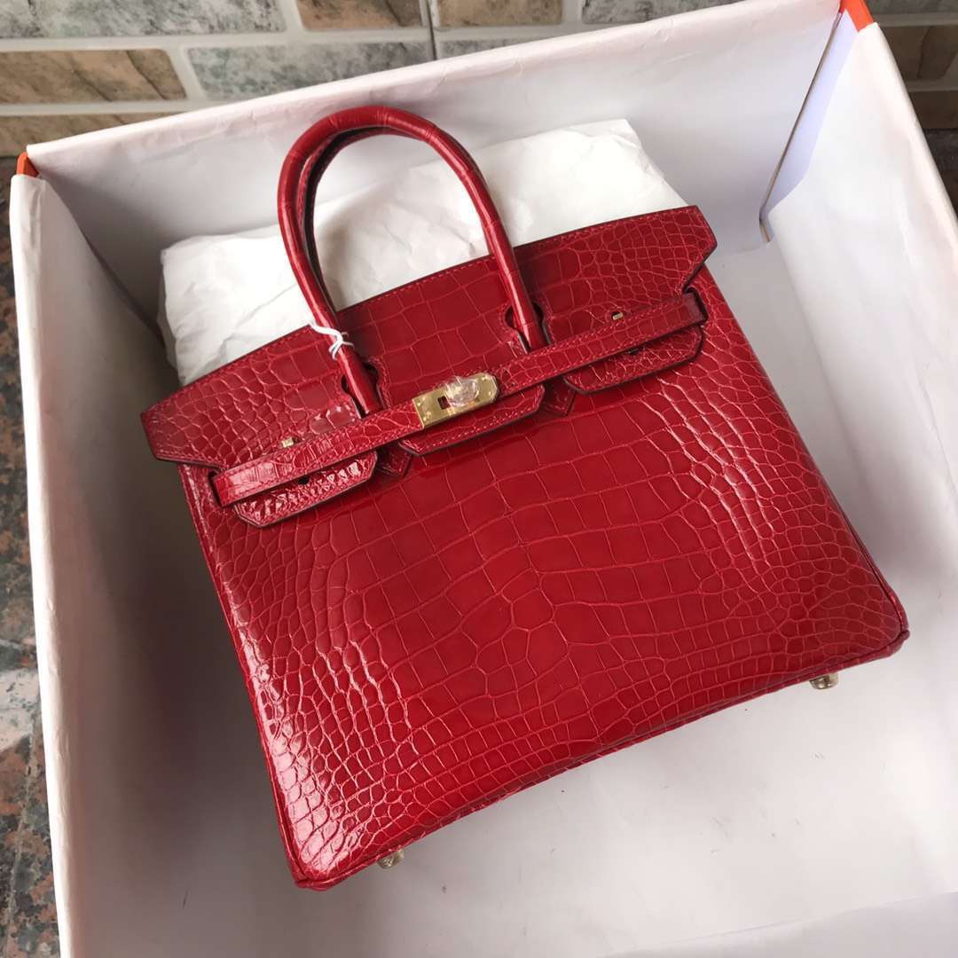 Brand: Hermes; Style: Birkin Bag; Material: Alligator Shiny Crocodile Leather;Color: CK95 Braise; Size:25cm; Hardware: Gold;Accessories: Padlock fand Keys, Dust Bag.Function:Tote Bag.