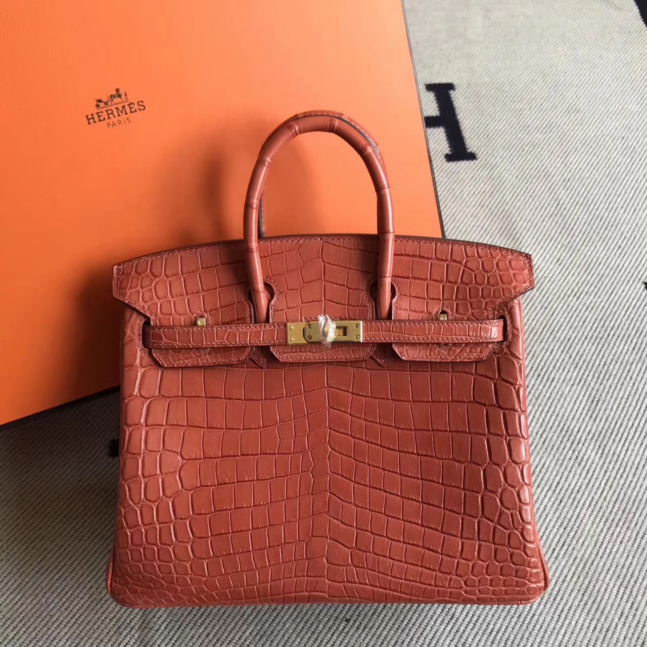Brand: Hermes; Style: Birkin Bag; Material: Crocodile Matt Leather;Color: Salmon Red;Size:25cm; Hardware: Gold; Accessories: Padlock and keys,dust bag.Function:tote bag.