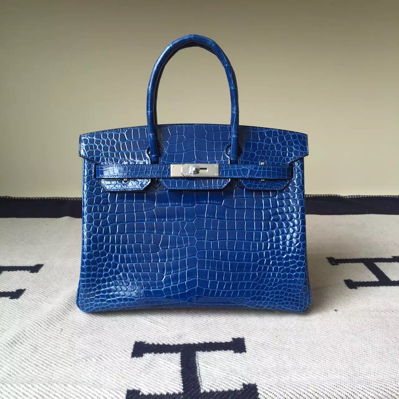 Brand: Hermes; Style: Birkin Bag 30cm; Material: Crocodile Shiny Leather;Color: 7Q Mykonos; Hardware: silver/gold; Accessories: Padlock and keys, dust bag.Function:tote bag.