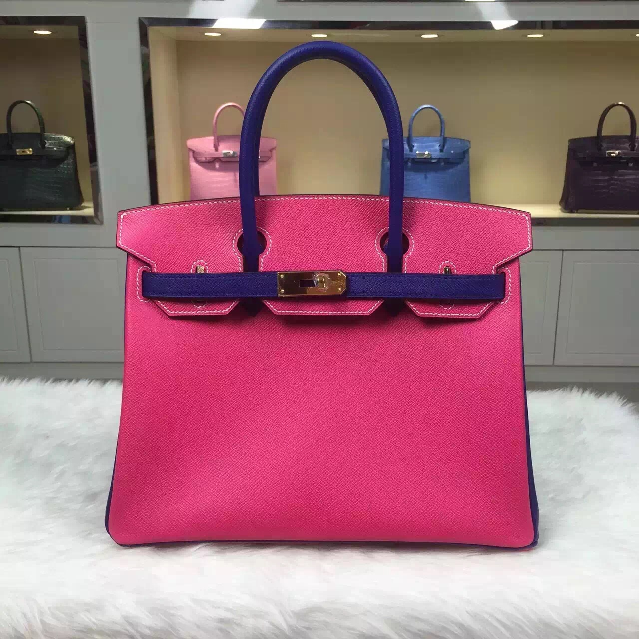 Brand: Hermes; Style: Birkin Bag30cm; Material: Epsom Leather(original leather);Color:E5 Candy Pink/7T Blue Electric; Hardware: gold/silver; Accessories: Padlock and keys, dust bag.Function:tote bag.