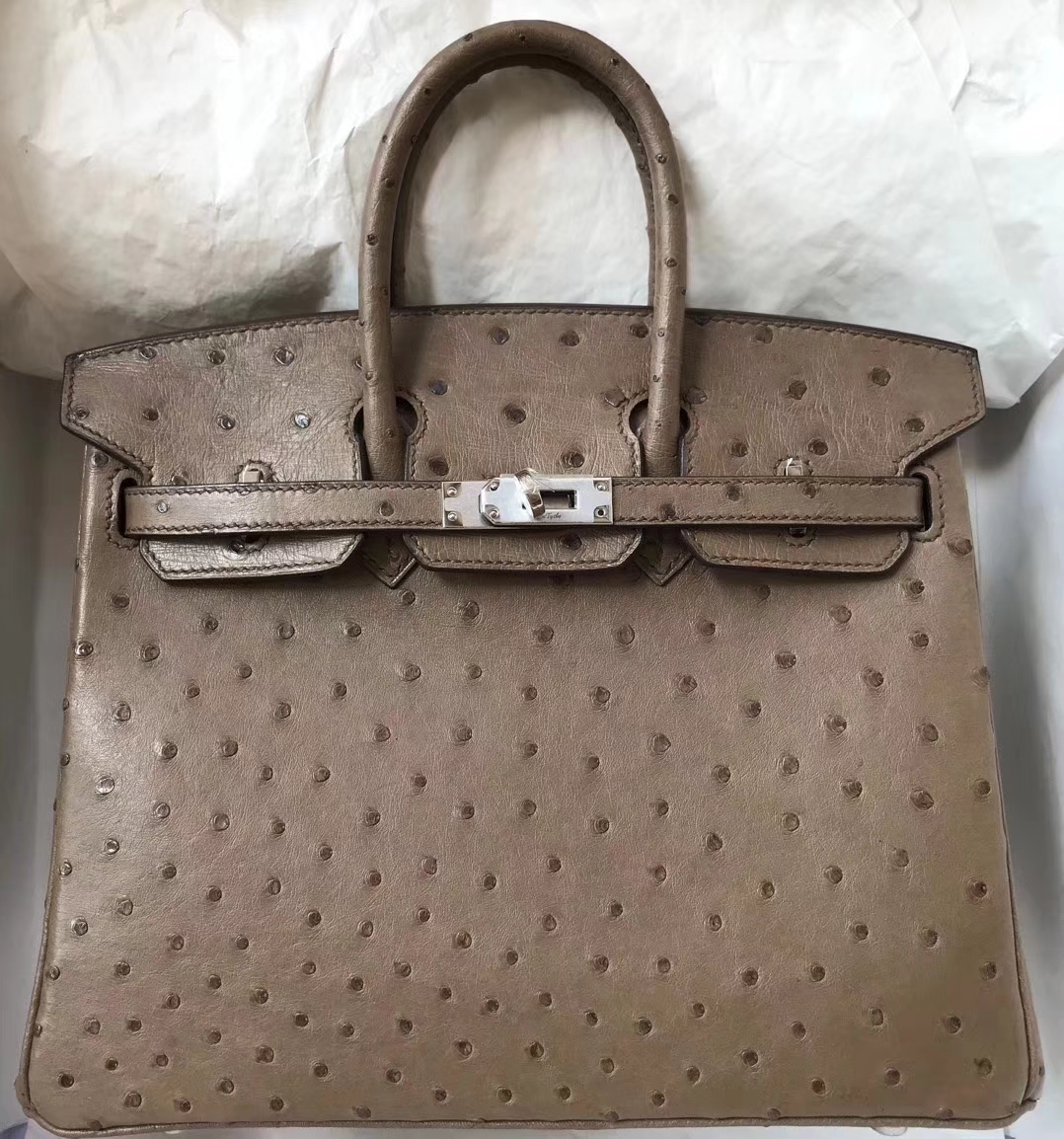 Brand: Hermes; Style: Birkin Bag; Material: Ostrich Leather;Color:CK18 Etoupe Grey; Size:25cm; Hardware:Silver;Accessories: Padlock fand Keys, Dust Bag.Function:Tote Bag.