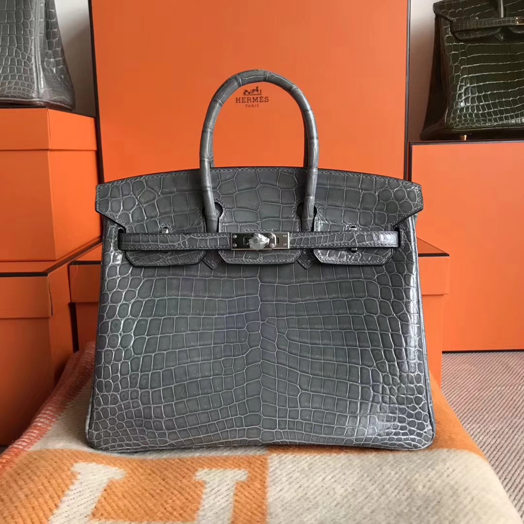 Hermes Shiny Crocodile Leather Birkin 25CM Bag in Mousse Grey