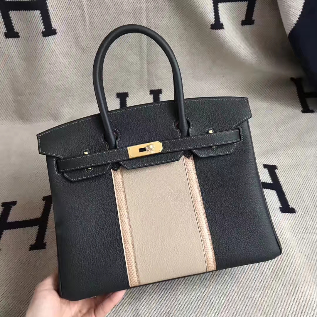 Brand: Hermes; Style: Birkin Bag; Material: Togo Calfskin Leather & Lizard Skin;Color: CK88 Graphite Grey/S2 Trench Grey/Apricot ; Size:30cm; Hardware: Gold; Accessories: Padlock and Keys, Dust Bag.Function:Tote Bag.
