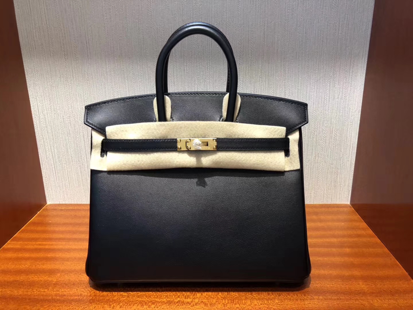 Brand: Hermes; Style: Birkin Bag; Material:Swift Calf Leather;Color:CK89 Black; Size:25cm; Hardware:Gold;Accessories: Padlock fand Keys, Dust Bag.Function:Tote Bag.