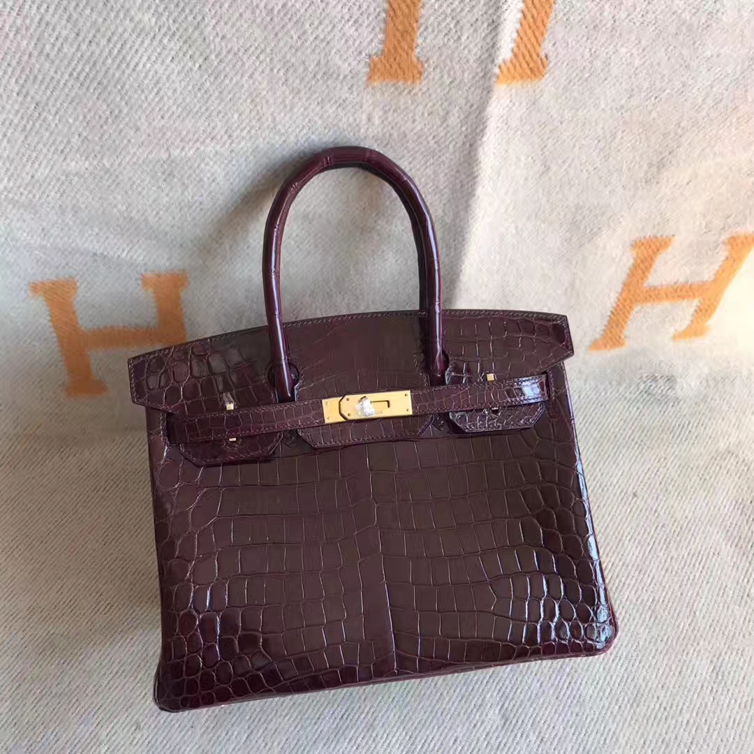 Brand: Hermes; Style: Birkin Bag; Material: Crocodile Shiny Leather;Color: CK57 Bordeaux Red; Size:30cm; Hardware:Gold; Accessories: Padlock and keys, Dust Bag.Function:Tote Bag.