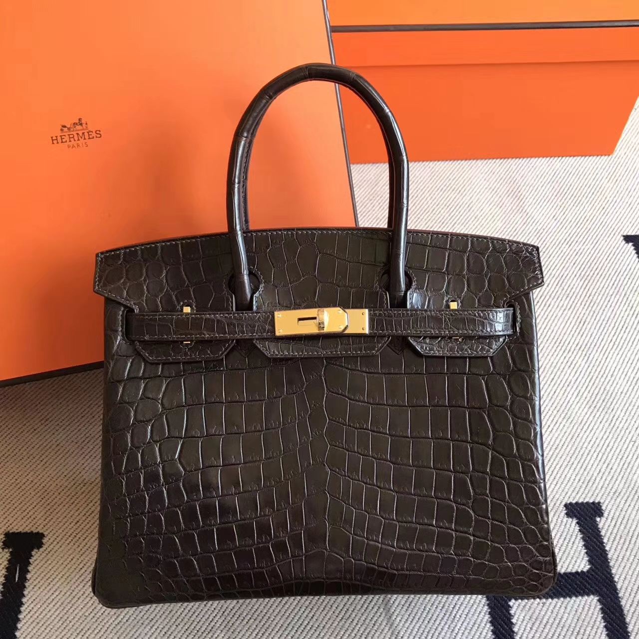 Brand: Hermes; Style: Birkin Bag; Material: Crocodile Matt Leather;Color:Chocolate Color; Size:30cm; Hardware: Gold; Accessories: Padlock and keys, dust bag.Function:tote bag.