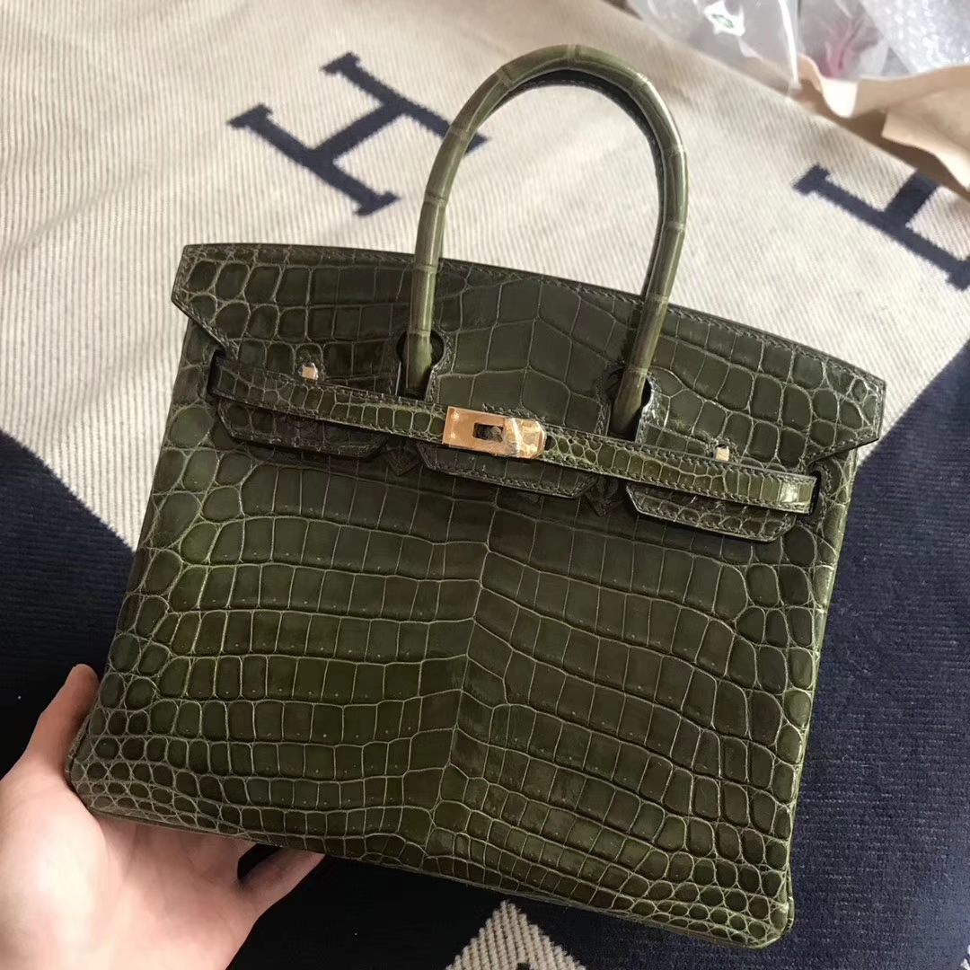 Brand: Hermes; Style: Birkin Bag; Material: Crocodile Shiny Leather;Color: V6 Canopee ; Size:25cm; Hardware: Gold; Accessories: Padlock and Keys, Dust Bag.Function:Tote Bag.
