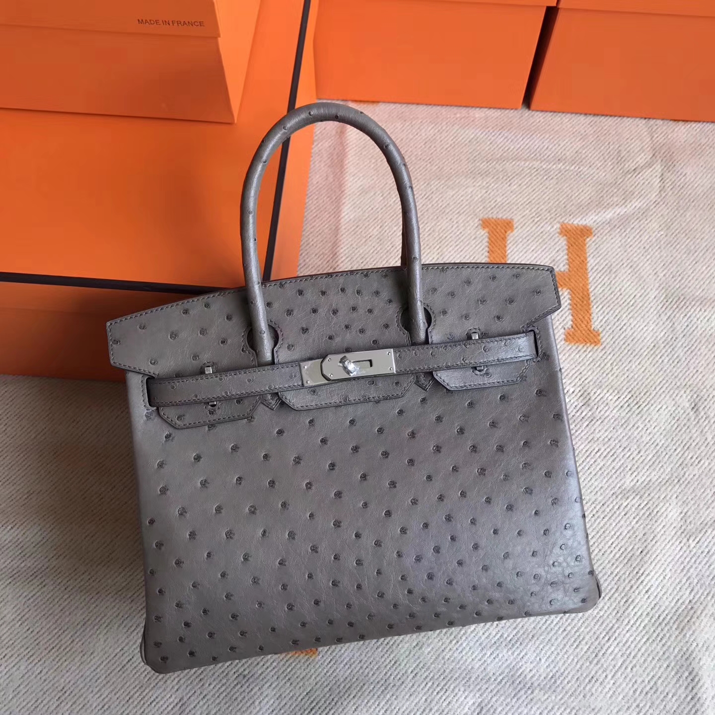 Hermes Ostrich Leather Birkin 30cm Handbag in Mousse Grey Silver Hardware