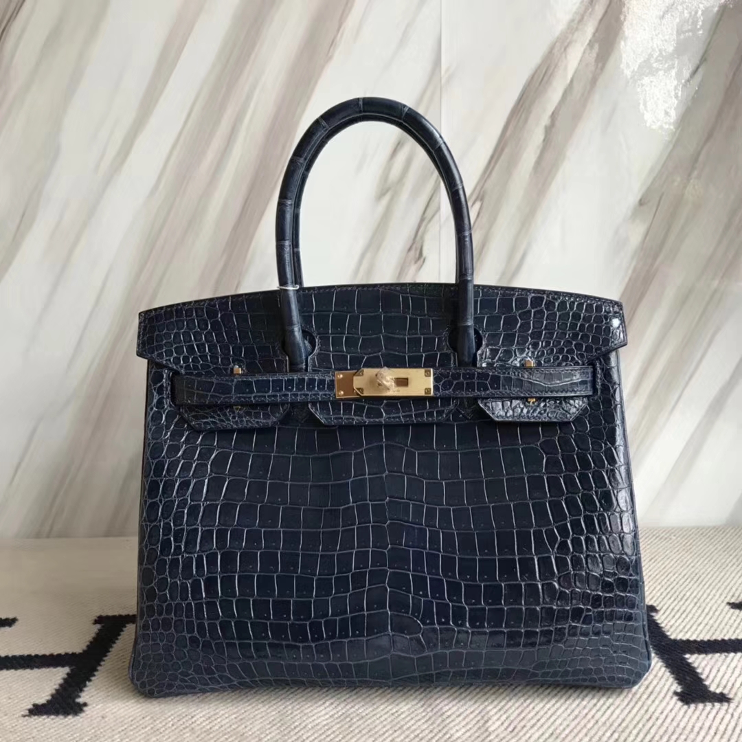 Hermes Shiny Crocodile Leather Birkin 30CM Bag in N7 Blue Tempete Gold Hardware