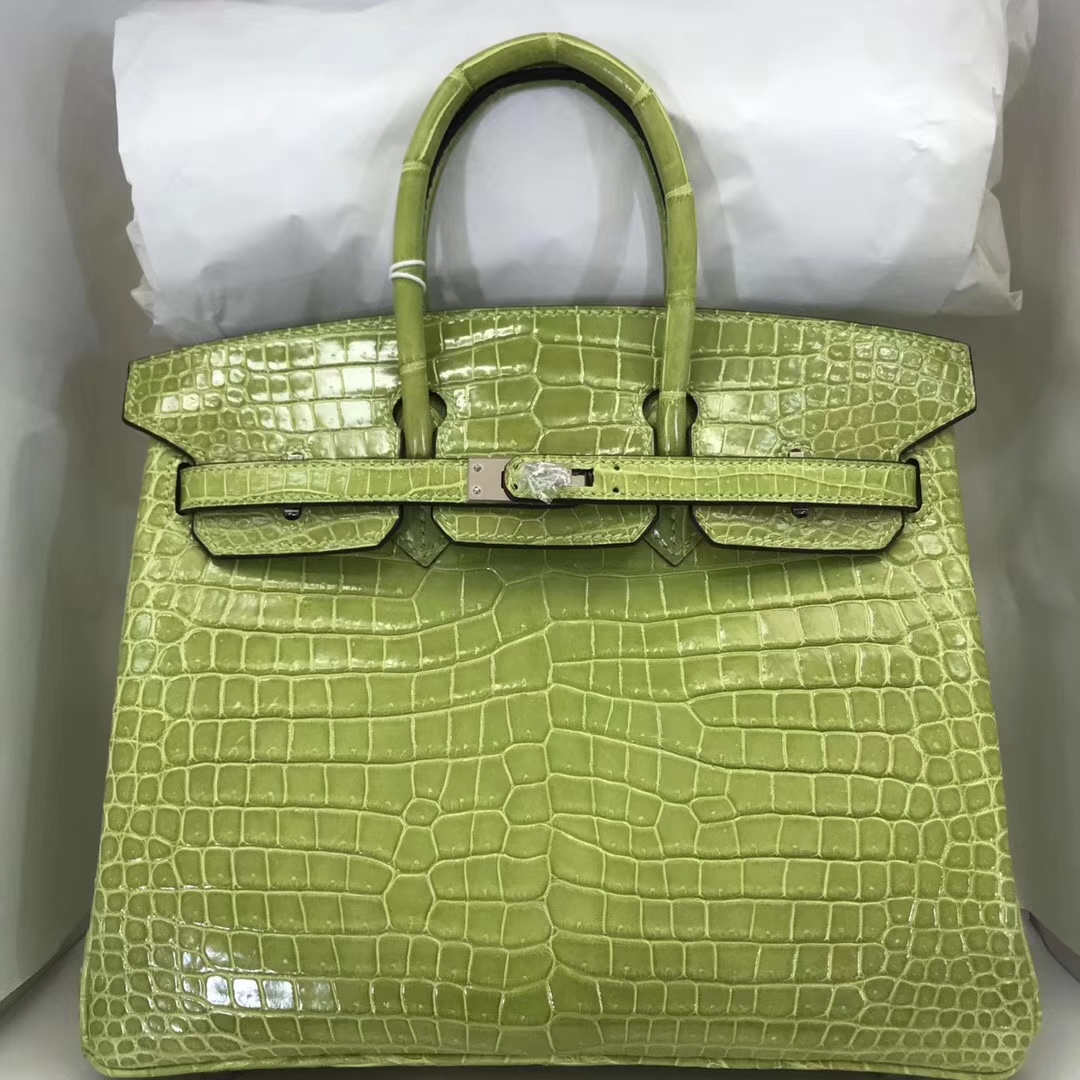 Brand: Hermes; Style: Birkin Bag; Material: Porosus Shiny Crocodile Leather;Color:6R Kiwi Green; Size:25cm; Hardware:Silver;Accessories: Padlock fand Keys, Dust Bag.Function:Tote Bag.