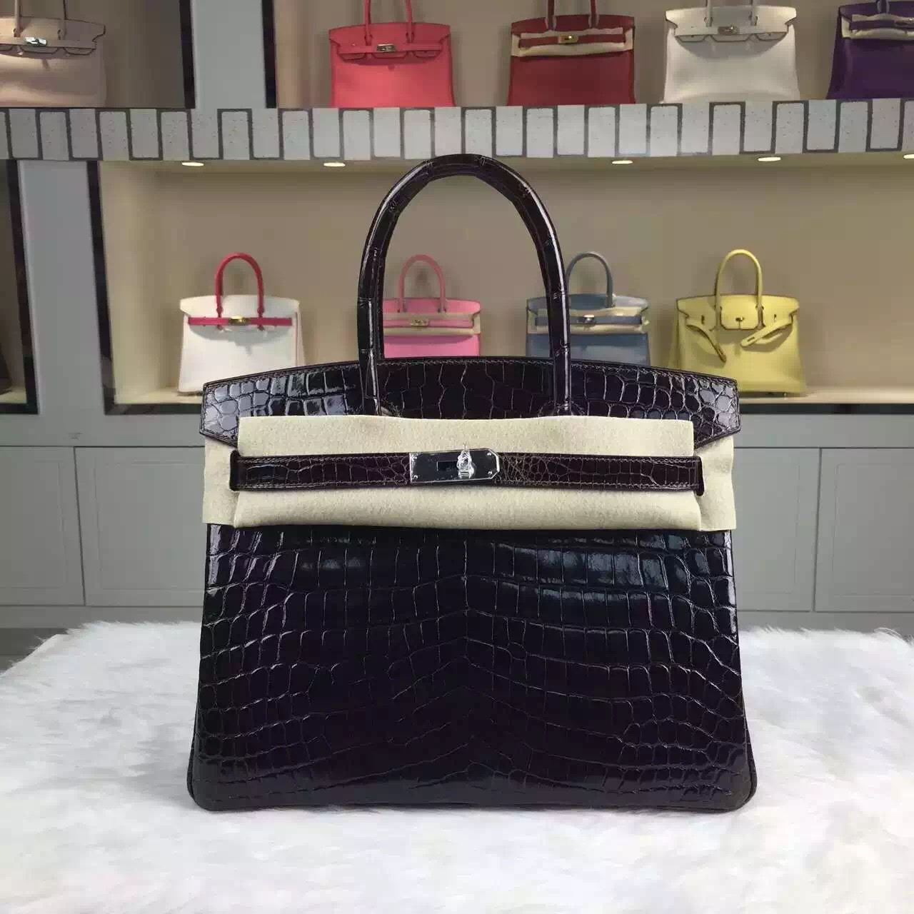 Brand: Hermes; Style: Birkin Bag30cm; Material:Crocodile Leather (HCP original leather);Color: Dark Coffee; Hardware: Silver/Gold; Accessories: Padlock and keys, dust bag.Function:tote bag.