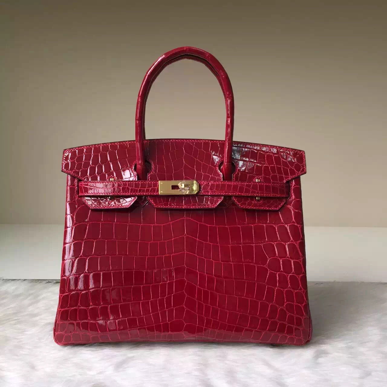 Hand Stitching Hermes Birkin 30cm CK55 Hermes Red Crocodile Shiny Leather