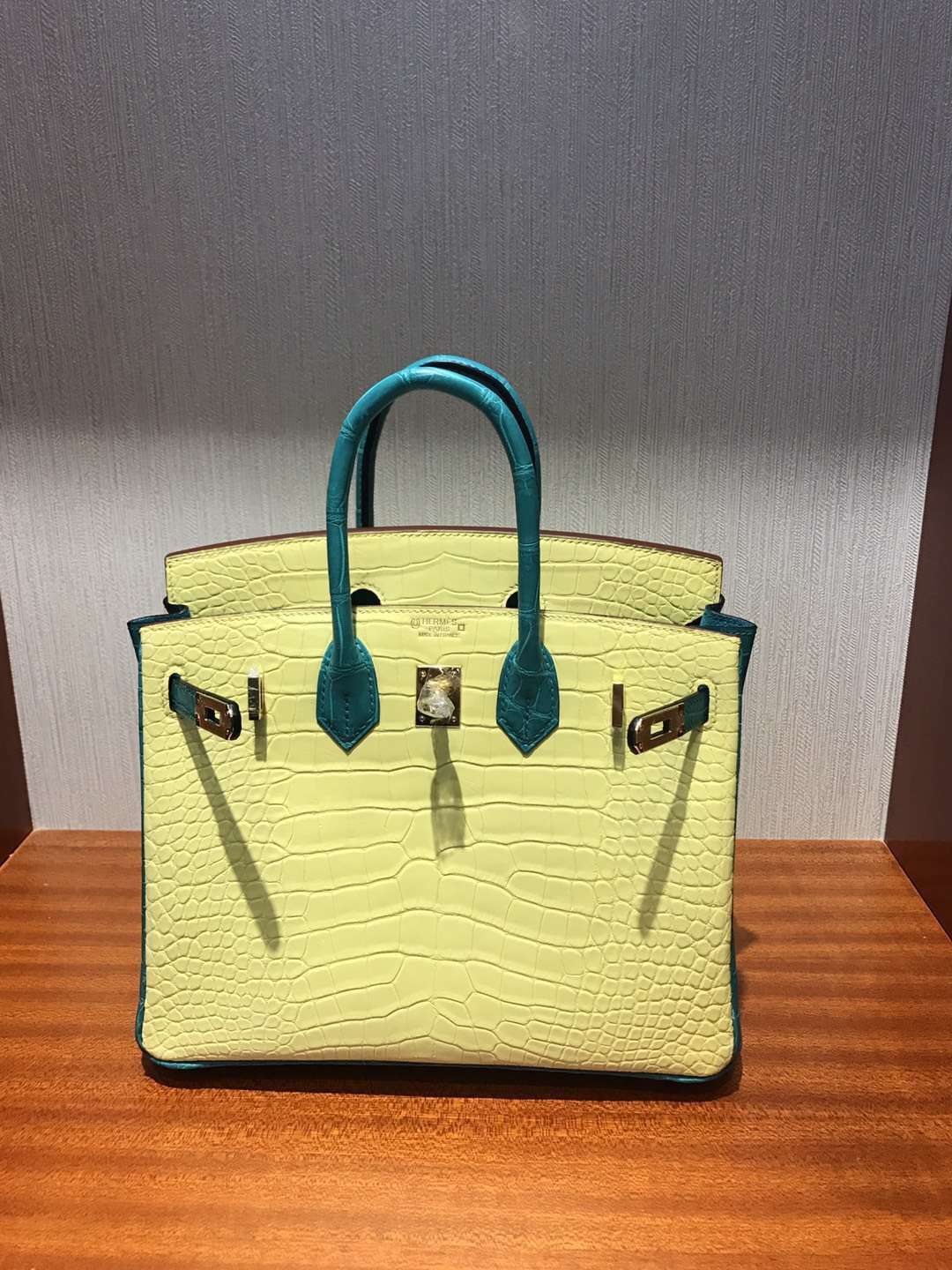 Brand: Hermes; Style: Birkin Bag; Material:Alligator Matt Crocodile Leather;Color:C9 Soupre Yellow/7F Blue Paon; Size:25cm; Hardware:Gold;Accessories: Padlock fand Keys, Dust Bag.Function:Tote Bag.