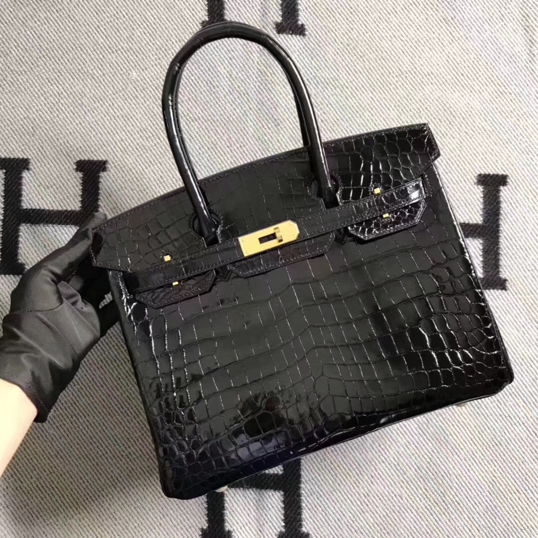 Hermes Classic Bag Black Shiny Crocodile Leather Birkin Bag 30CM Gold Hardware