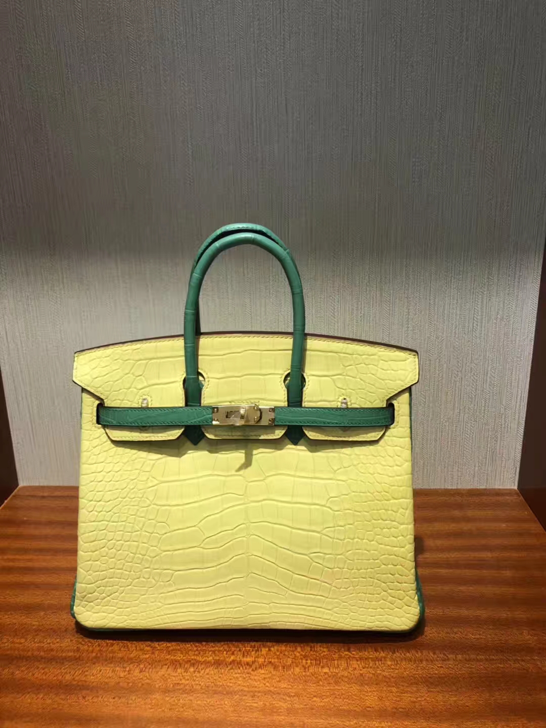 Brand: Hermes; Style: Birkin Bag; Material:Alligator Matt Crocodile Leather;Color:Mimosa Yellow & Bamboo Green; Size:25cm; Hardware:Gold;Accessories: Padlock fand Keys, Dust Bag.Function:Tote Bag.