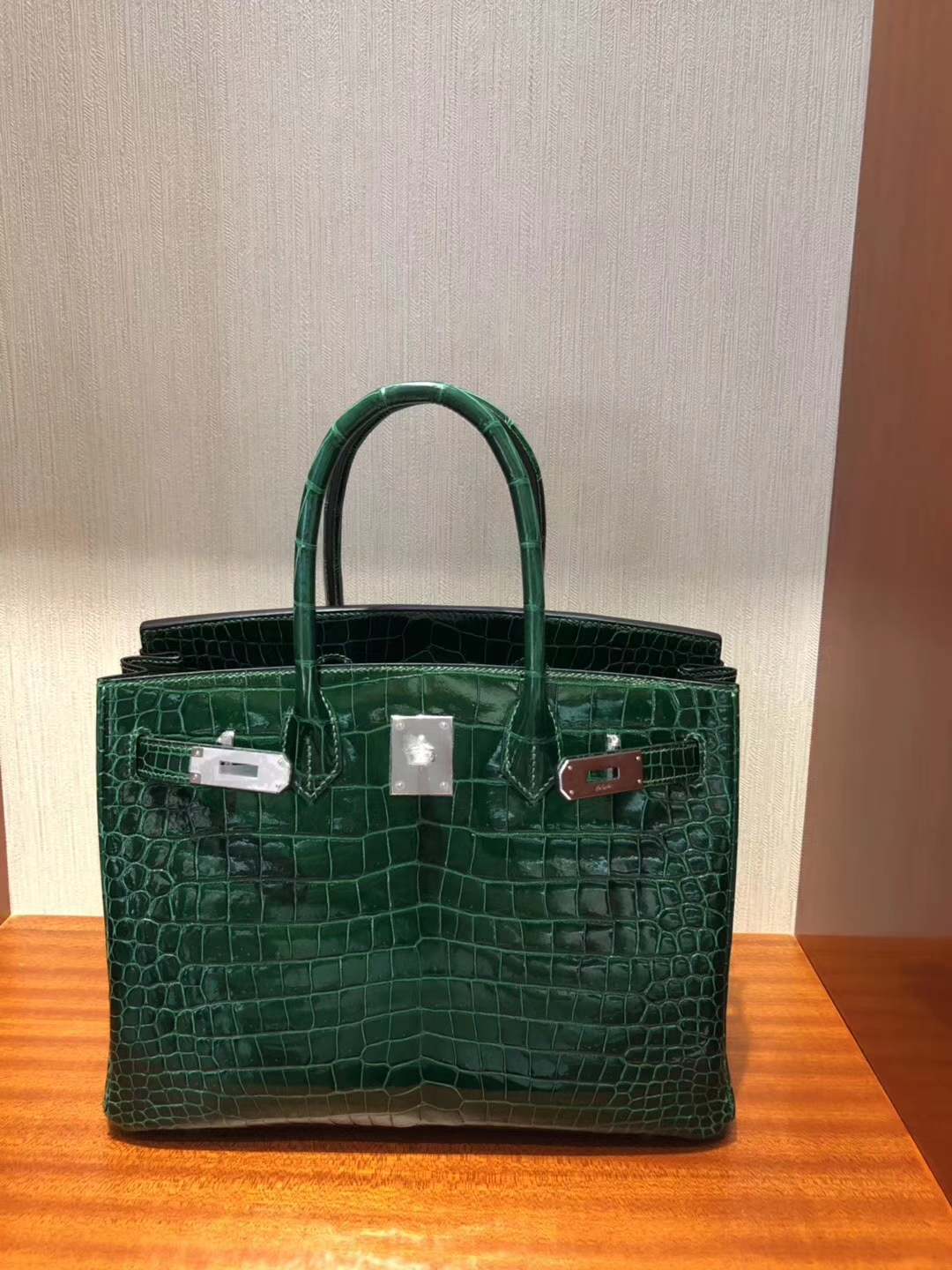 Brand: Hermes; Style: Birkin Bag; Material:Porosus Shiny Crocodile Leather;Color:CK67 Vert Fonce; Size:30cm; Hardware:Silver;Accessories: Padlock fand Keys, Dust Bag.Function:Tote Bag.