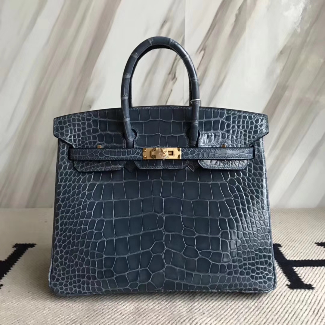 Brand: Hermes; Style: Birkin Bag; Material:Alligator Shiny Crocodile Leather;Color:1P Blue Colvert; Size:25cm; Hardware:Gold;Accessories: Padlock fand Keys, Dust Bag.Function:Tote Bag.