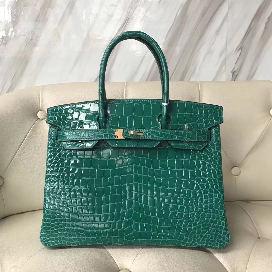 Hermes 6Q Emerald Green Shiny Crocodile Leather Birkin 30CM Bag Gold Hardware