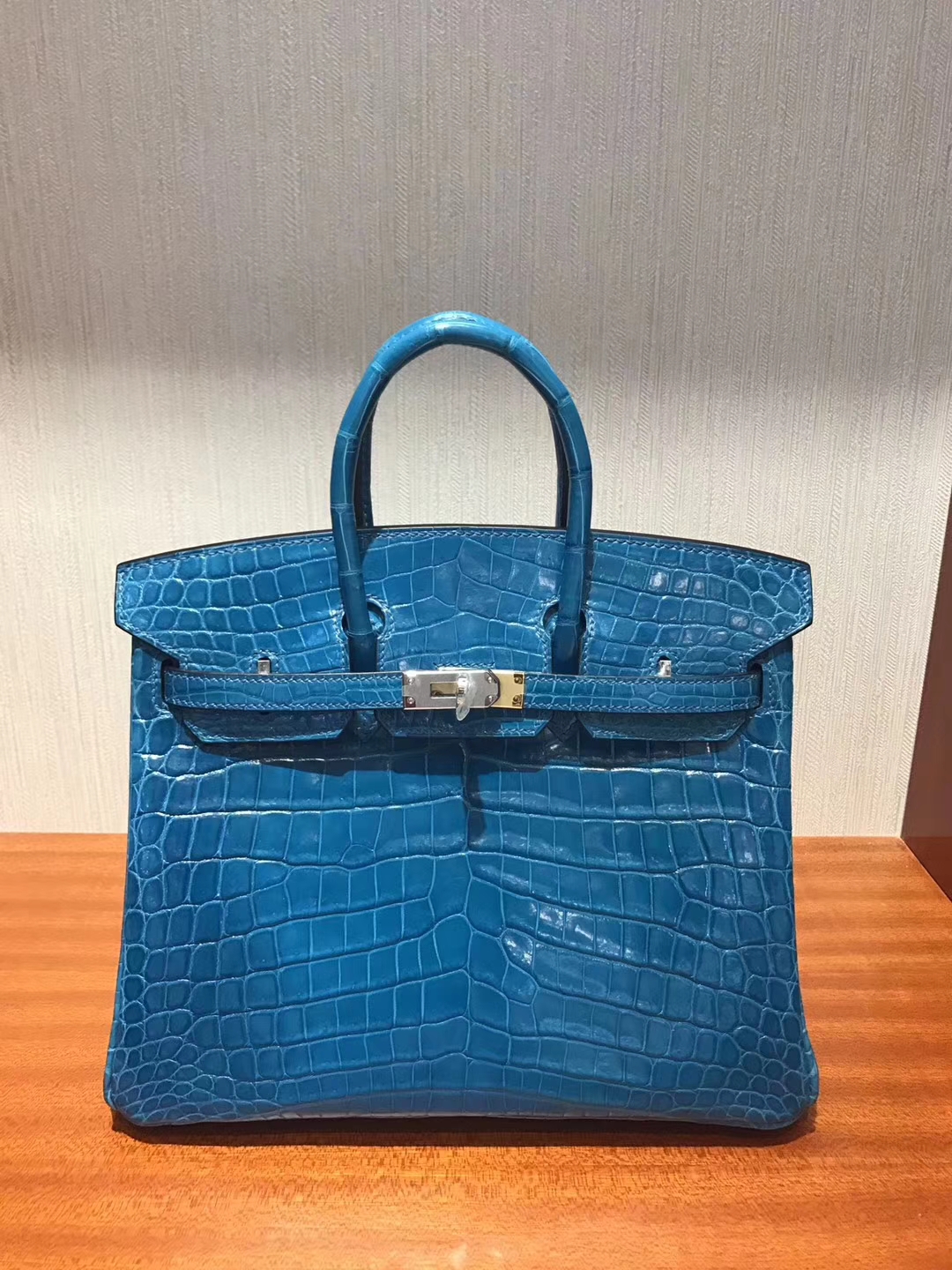 Brand: Hermes; Style: Birkin Bag; Material: Crocodile Shiny Leather;Color: 7W Blue Izmir; Size:25cm; Hardware: Silver ;Accessories: Padlock and Keys, Dust Bag.Function:Tote Bag.