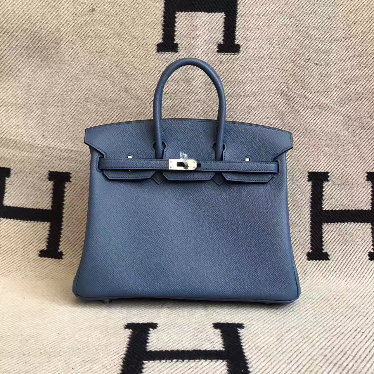 Brand: Hermes; Style: Birkin Bag 25cm; Material: Epsom Calfskin Leather;Color:2R Agate Blue; Hardware: silver/gold; Accessories: Padlock and keys,dust bag.Function:tote bag.