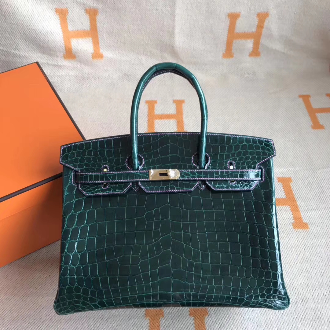 Brand: Hermes; Style: Birkin Bag; Material: Crocodile Shiny Leather;Color: CK67 Vert Fonce &Candy Pink ; Size:35cm; Hardware: Gold; Accessories: Padlock and Keys, Dust Bag.Function:Tote Bag.