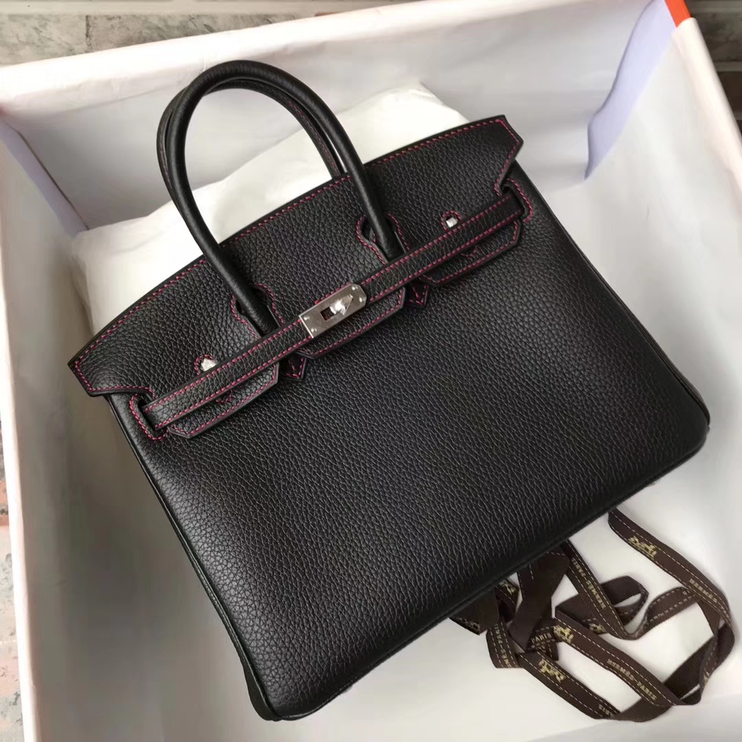 Brand: Hermes; Style: Birkin Bag; Material: Togo Calfskin Leather;Color: CK89 Black/Q5 Rouge Casaque Inner; Size:25cm; Hardware: Silver;Accessories: Padlock fand Keys, Dust Bag.Function:Tote Bag.