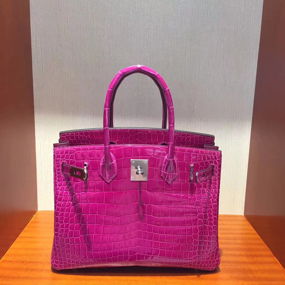 Brand: Hermes; Style: Birkin Bag; Material:Shiny Porosus Crocodile Leather;Color:J5 Rose Scheherazade; Size:30cm; Hardware:Silver;Accessories: Padlock fand Keys, Dust Bag.Function:Tote Bag.