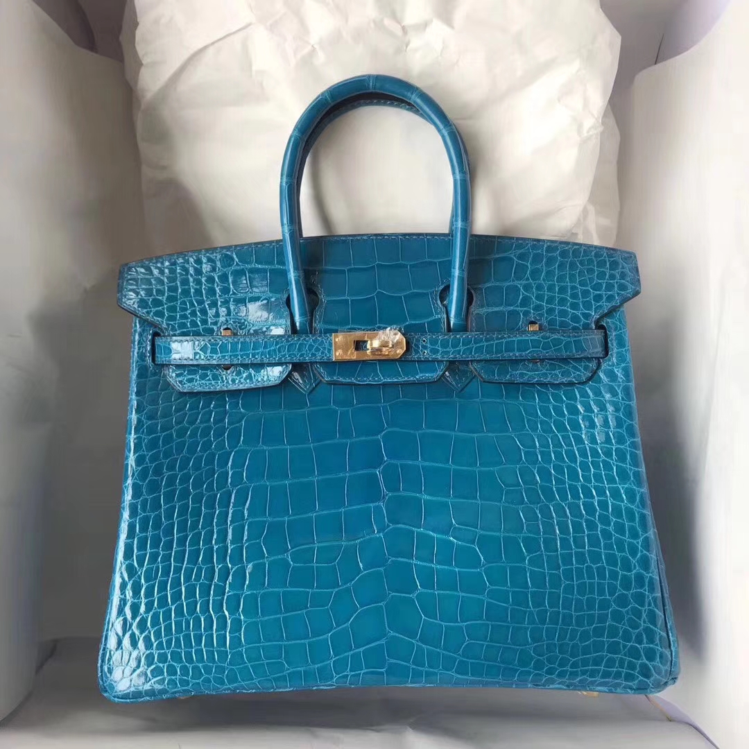Brand: Hermes;Style:Birkin Bag;Material:Shiny Alligator Crocodile Leather;Color:7W Blue Izmir;Size:25cm;Hardware:Gold;Accessories: Padlock fand Keys, Dust Bag.Function:Tote Bag.