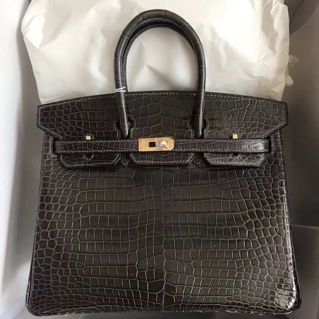 Hermes Shiny Crocodile Leather Birkin 25CM Bag in CK88 Graphite Grey