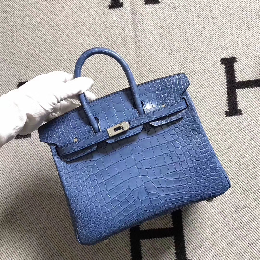 Brand: Hermes; Style: Birkin Bag; Material: Alligator Crocodile Leather;Color:Blue Jean; Size:25cm; Hardware: Silver; Accessories: Padlock and Keys, Dust Bag.Function:Tote Bag.