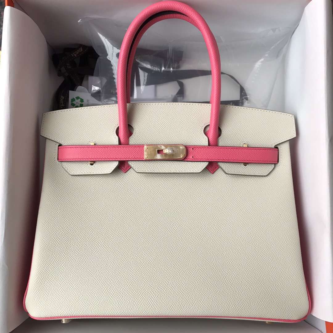 Brand: Hermes; Style: Birkin Bag; Material: Epsom Calfskin Leather;Color: CK10 Craie/8W Rose Lipstick; Size:30cm; Hardware:Gold;Accessories: Padlock fand Keys, Dust Bag.Function:Tote Bag.