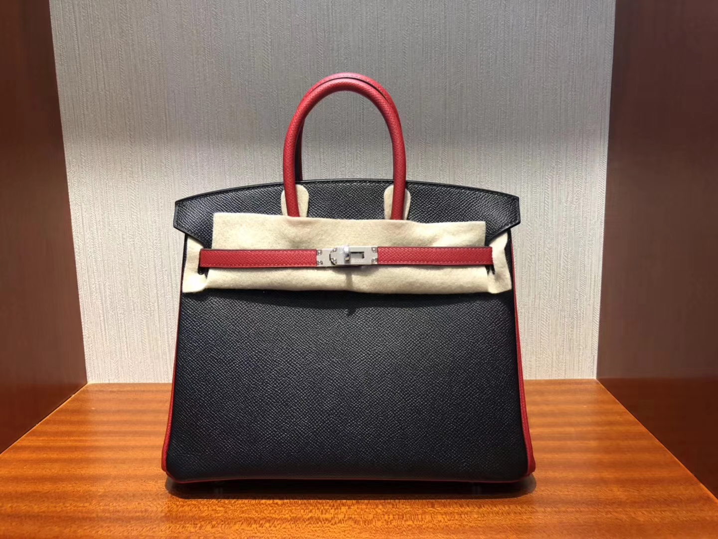 Brand: Hermes; Style: Birkin Bag; Material:Epsom Calf Leather;Color:CK89 Black/Q5 Rouge Casaque; Size:25cm; Hardware:Silver;Accessories: Padlock fand Keys, Dust Bag.Function:Tote Bag.