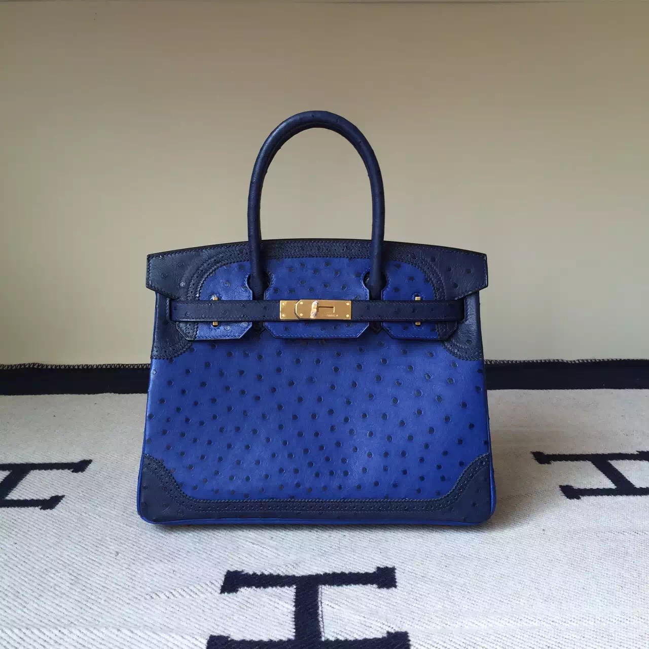 Hermes Ghillies Birkin Bag 30cm 7T Blue Electric/73 Dark Blue Ostrich Leather