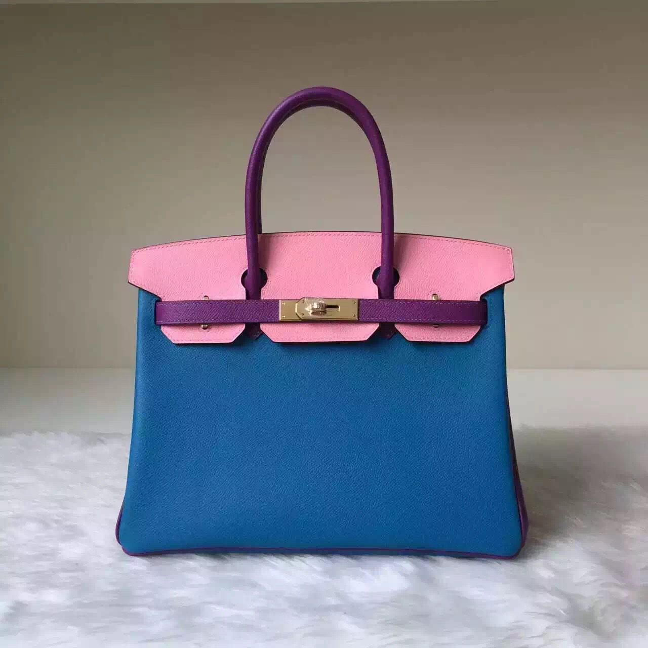 Brand: Hermes; Style: Birkin Bag 30cm; Material: Epsom Calfskin Leather;Color: 1Q Rose Confetti/ 7W Blue Izmir/ P9 Anemone; Hardware: Silver/Gold; Accessories: Padlock and keys, dust bag.Function:tote bag.
