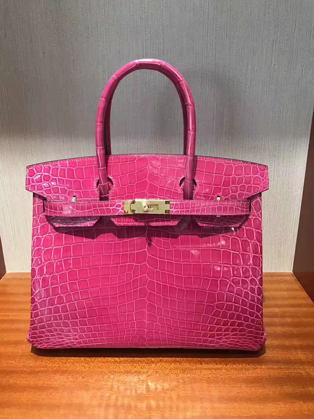 Brand: Hermes; Style: Birkin Bag; Material: Crocodile Shiny Leather;Color:5J Peach Pink; Size:30cm; Hardware: Gold; Accessories: Padlock and Keys, Dust Bag.Function:Tote Bag.