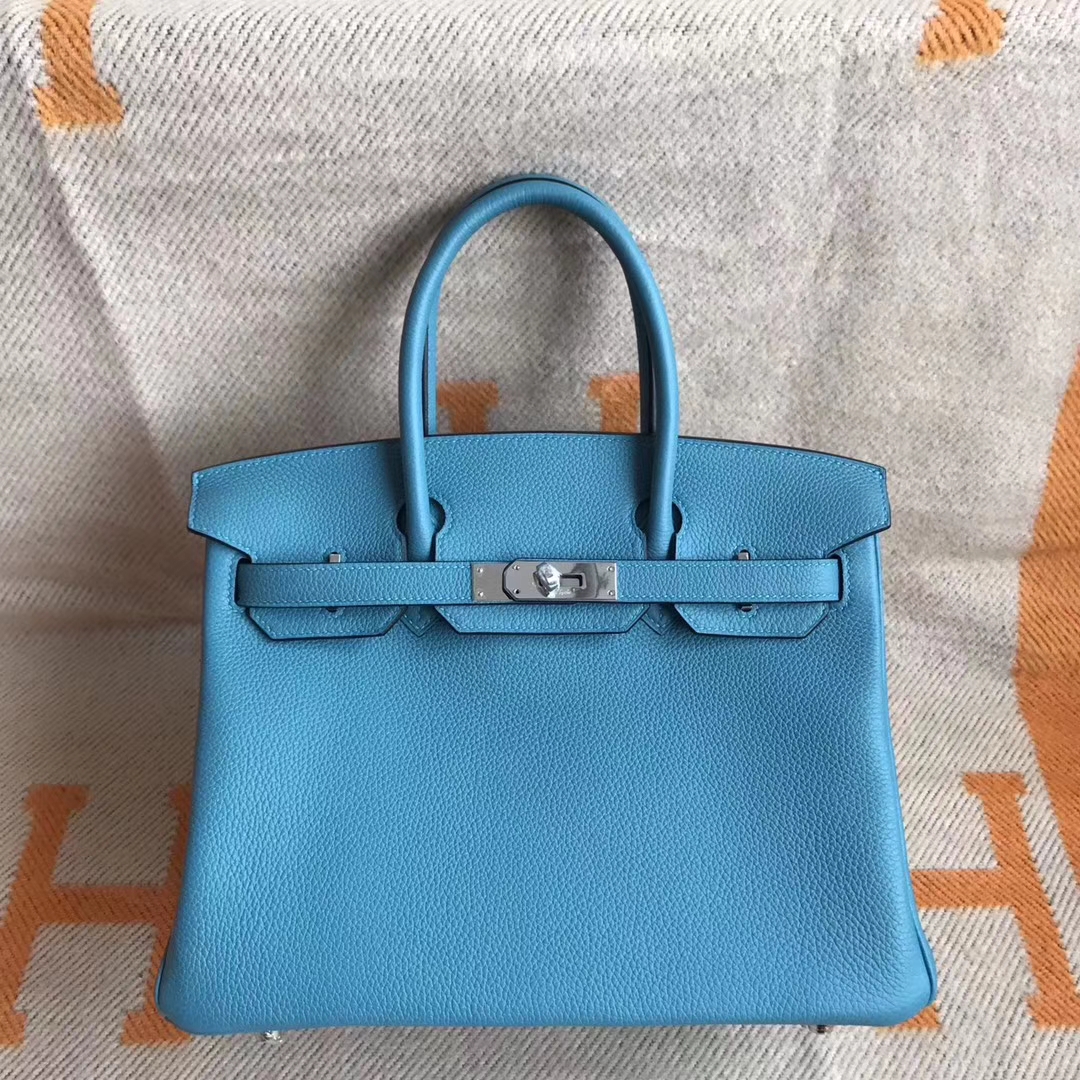 Brand: Hermes; Style: Birkin Bag; Material: Togo Calfskin Leather;Color: 7K Turquoise Blue; Size:30cm; Hardware: Silver/Gold; Accessories: Padlock and Keys, Dust Bag.Function:Tote Bag.
