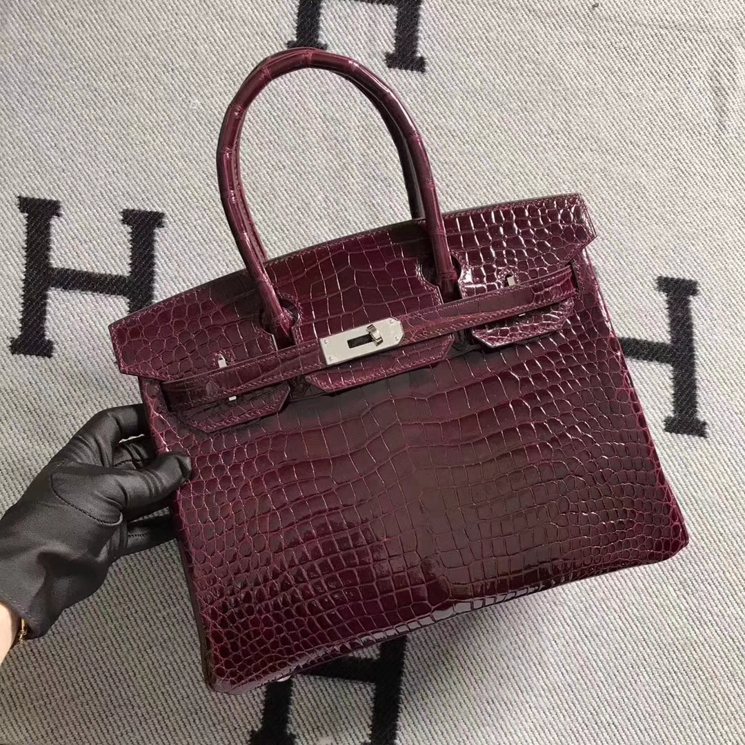Brand: Hermes; Style: Birkin Bag; Material: Shiny Crocodile Leather;Color: Bordeaux Red; Size:30cm; Hardware: Silver ;Accessories: Padlock and Keys, Dust Bag.Function:Tote Bag.