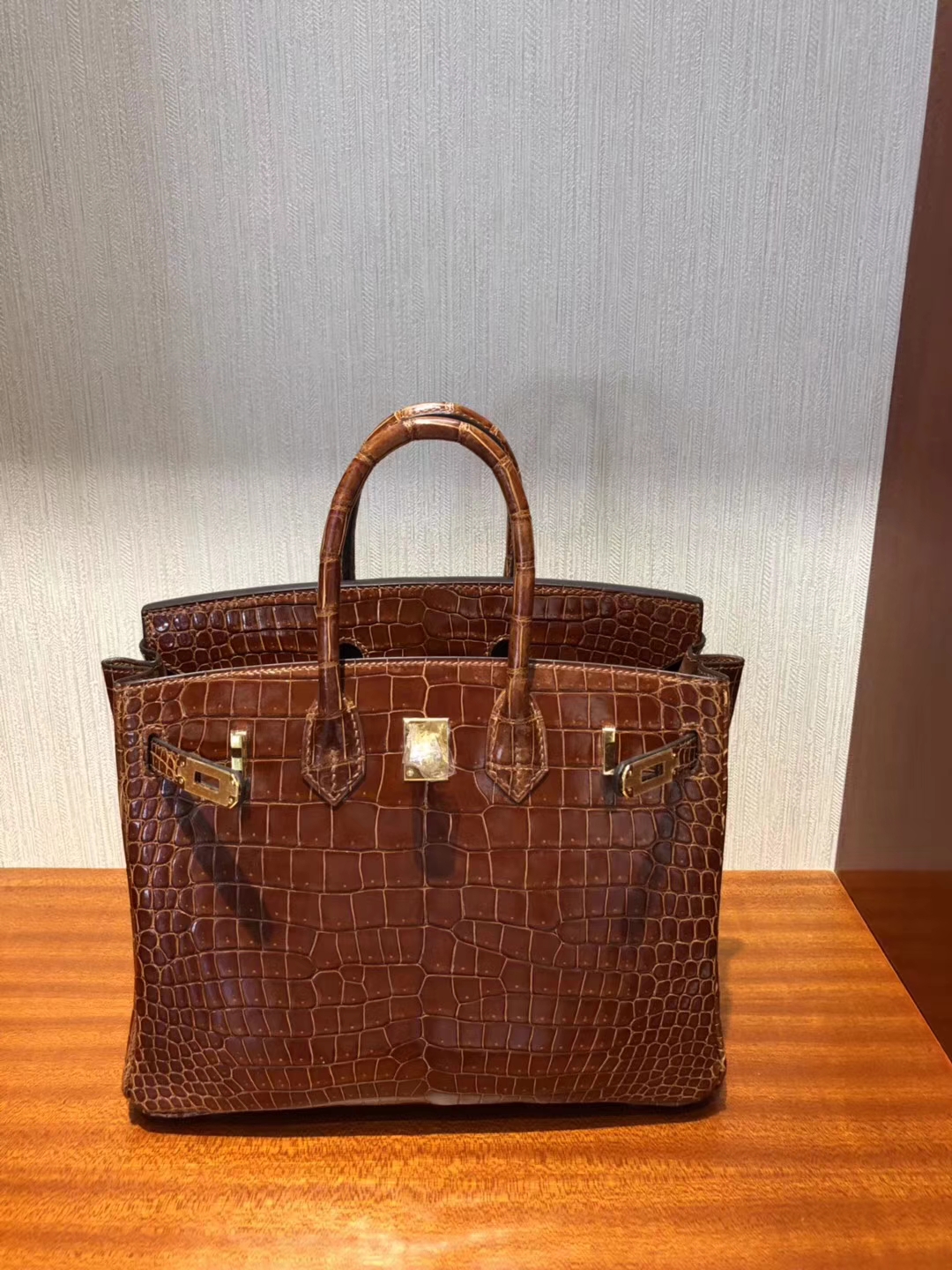 Brand: Hermes; Style: Birkin Bag; Material:Porosus Shiny Crocodile Leather;Color:CK31 Honey Brown; Size:25cm; Hardware:Gold;Accessories: Padlock fand Keys, Dust Bag.Function:Tote Bag.