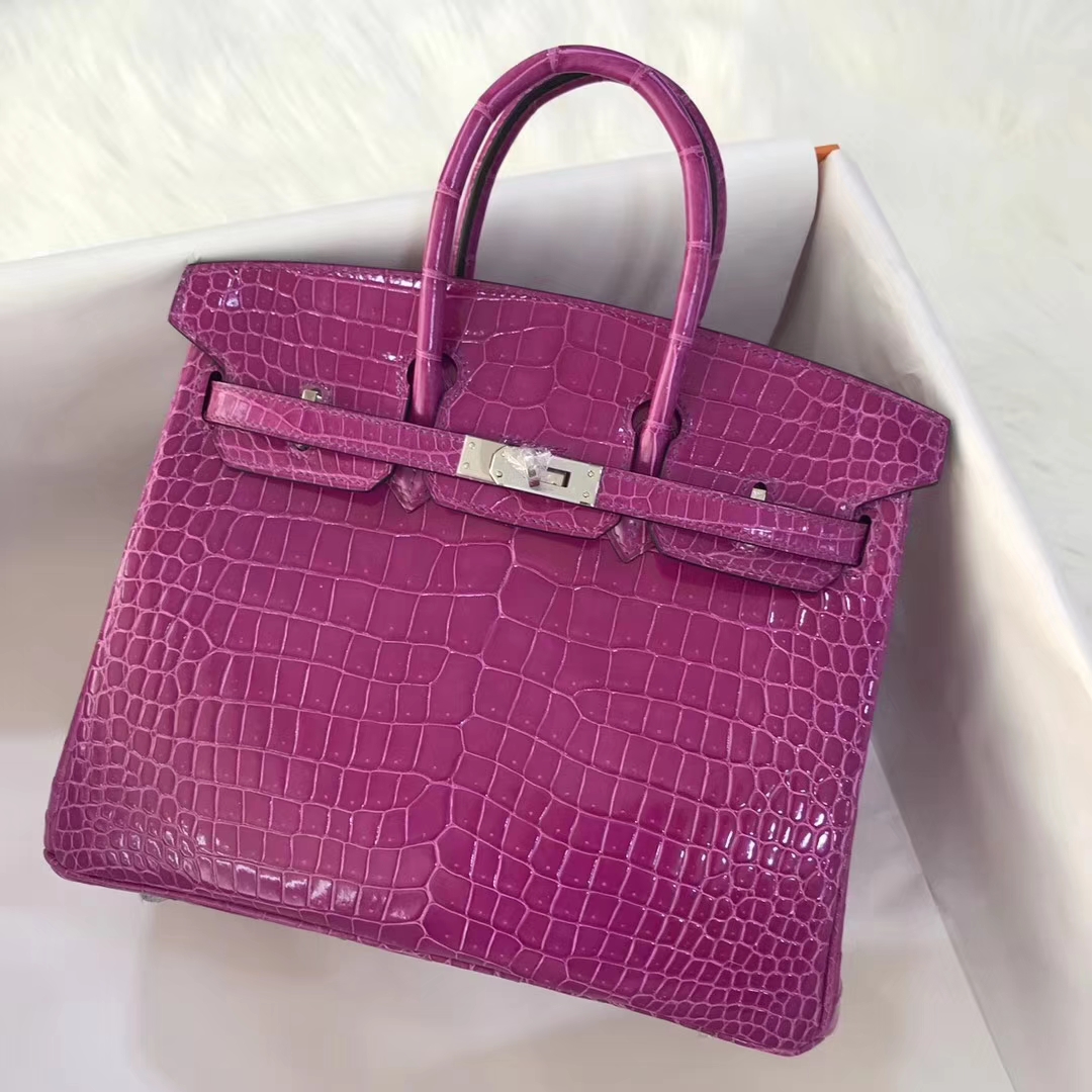 Brand: Hermes; Style: Birkin Bag; Material: Porosus Shiny Crocodile Leather;Color:L3 Rose Purple ; Size:25cm; Hardware:Silver;Accessories: Padlock fand Keys, Dust Bag.Function:Tote Bag.