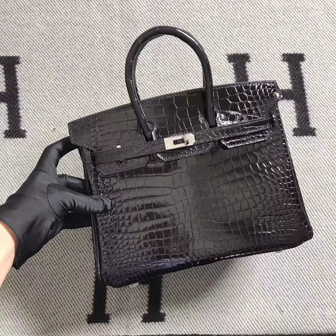Brand: Hermes; Style: Birkin Bag; Material:Shiny Crocodile Leather;Color:Black; Size:25cm; Hardware:Silver;Accessories: Padlock fand Keys, Dust Bag.Function:Tote Bag.
