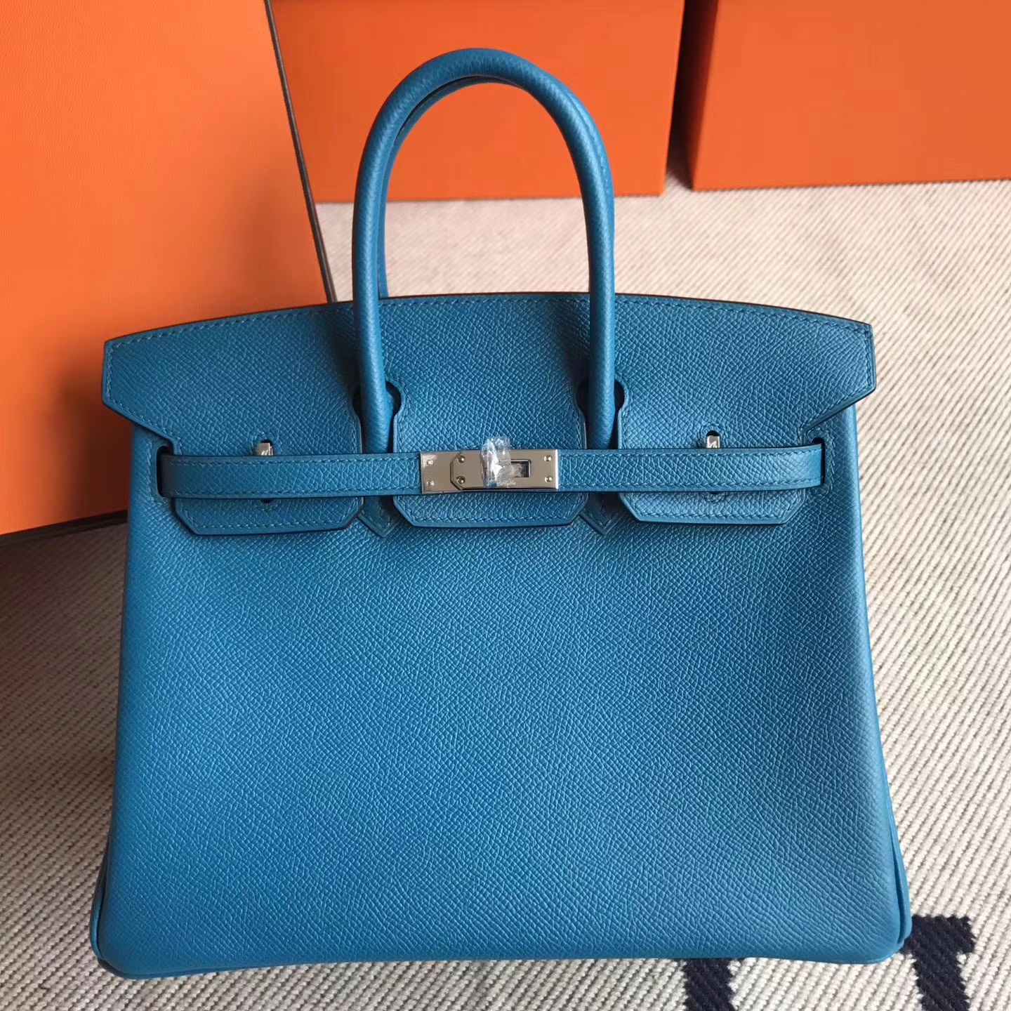 Brand: Hermes; Style: Birkin Bag ; Material: Epsom Calfskin Leather;Color:Blue Izmir; Size:25cm;Hardware: Silver; Accessories: Padlock and keys,dust bag.Function:tote bag.