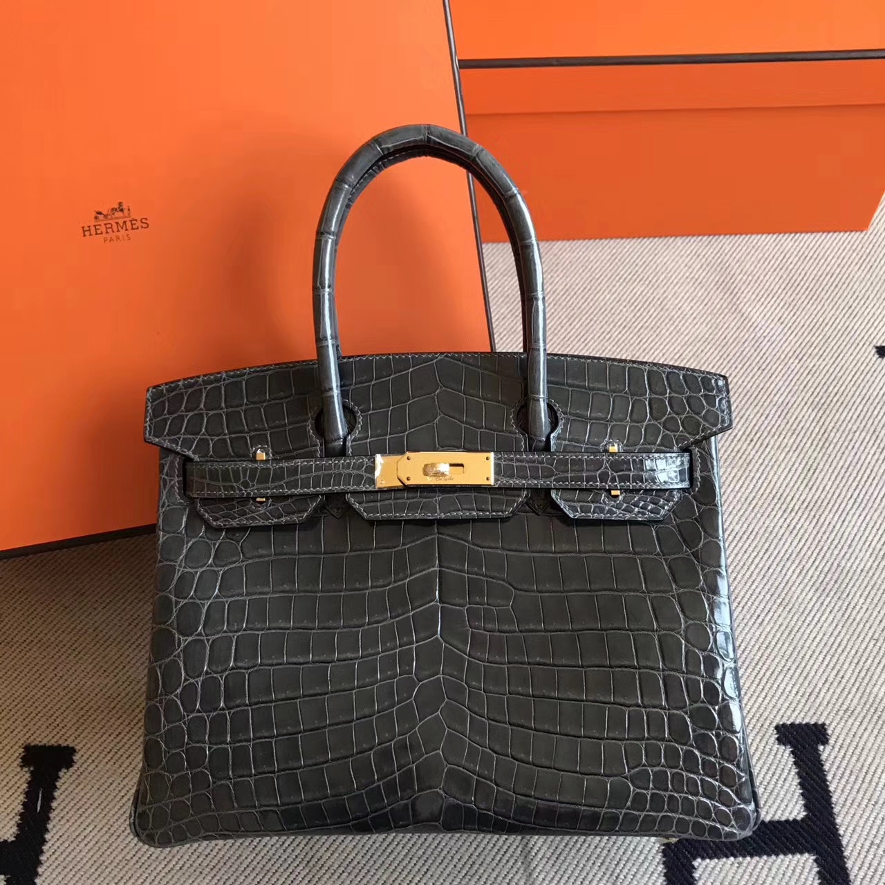 On Hermes Birkin 30cm Handbag in Ck88 Graphite Grey Crocodile Shiny Leather