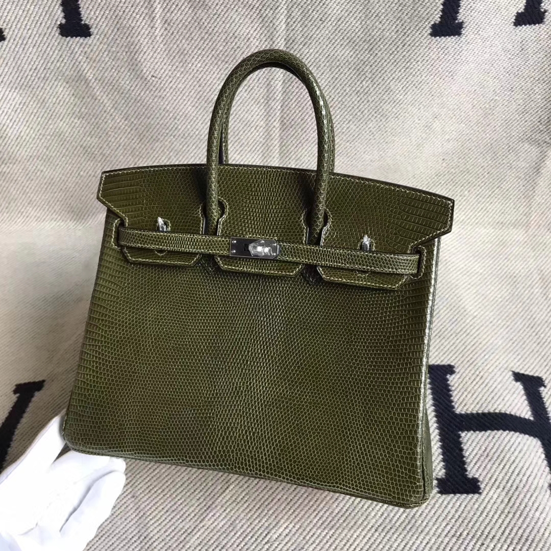 Brand: Hermes; Style: Birkin Bag; Material: Lizard Skin Leather;Color: V6 Olive Green ; Size:25cm; Hardware: Silver; Accessories: Padlock and Keys, Dust Bag.Function:Tote Bag.