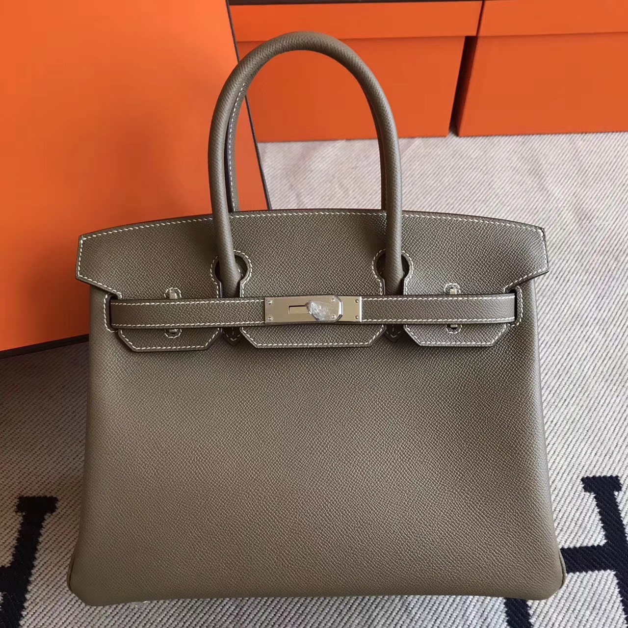 Brand: Hermes; Style: Birkin Bag; Material: Epsom Calfskin Leather;Color:CK18 Etoupe Grey; Size:30cm; Hardware: Silver; Accessories: Padlock and keys, dust bag.Function:tote bag.